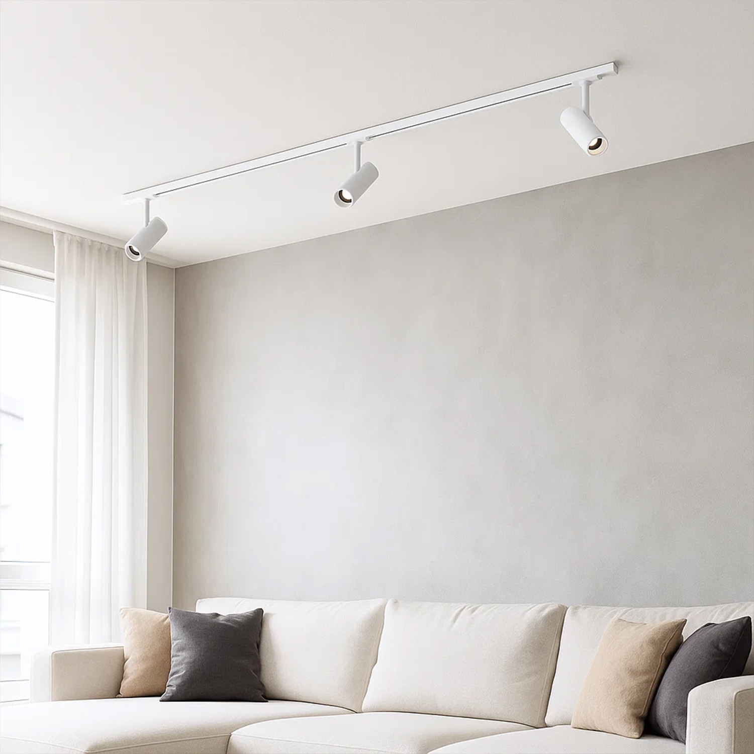 Komplett skinnesett med Global 1-fas skinne på 2 meter og tre Cylinder spotter. Spottene leveres med integrert LED-modul og adapter, og monteres direkte på skinnen uten ekstra deler. Hver spot er 220 mm høy og 60 mm i diameter, og kan vinkles 90° og roteres 350°. De kan også flyttes fritt langs skinnen, slik at du enkelt kan tilpasse lyssettingen uten endringer i kablingen.