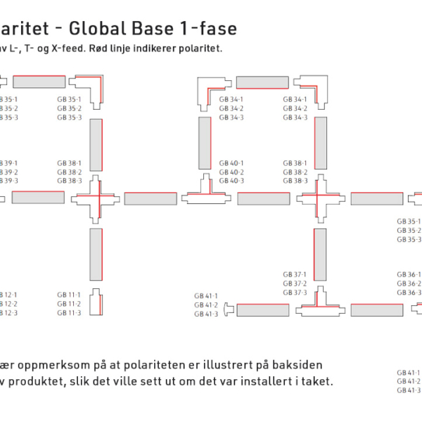 Global Base 1-fase strømforsyning. Brukes til å koble spenning (230V) til enden av skinnen. Tilgjengelig i to varianter (GB11 & GB12) avhengig av hvilken side av skinnen strømforsyningen skal kobles til. Når du kobler til en rett skinnelengde, er typen strømforsyning ikke avgjørende ettersom skinnen kan snus om nødvendig. Imidlertid anbefaler vi vanligvis å bruke den venstre tilkoblingen (GB11), da det gir bedre utnyttelse av skinnens bredde. Dette skyldes at spotlighten kun kan monteres fra én side av skinnen. Ved å montere strømforsyning på venstre side får du bedre utnyttelsen av skinnens bredde. Strømforsyningen kan også brukes til å knytte flere skinner sammen. Bruk da to forskjellige typer strømforsyninger (1x GB11 & 1x GB12) med en kabel mellom. Trenger du hjelp til å bestemme eller kontrollere riktig kombinasjon av tilbehør? Kontakt kundeservice.