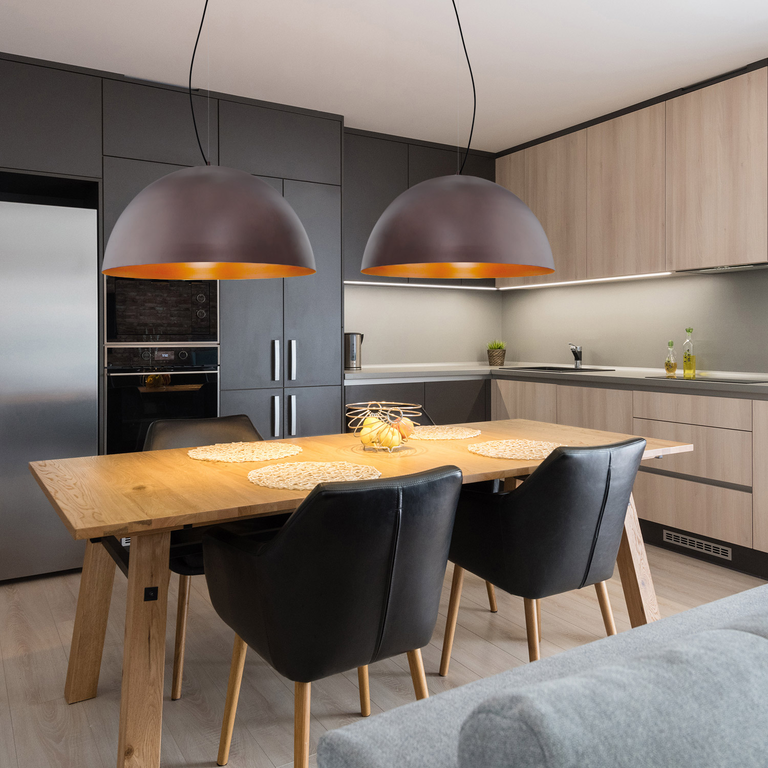 Globe anbefales over spisestuebord eller kjøkkenøy. Lampen er hele 70 cm i diameter. Den store skjermen gjør at du får svært godt lys uten å bli blendet. Store lamper bør monteres med en avstand på 60-75 cm mellom bordflaten og lampens underkant.