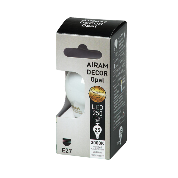 Lyskildene i Amber-serien minner om atmosfæriske glødelamper, men i en moderne LED-versjon. Lyset er varmt og mykt med en utmerket spredningsvinkel på 360 grader. Glasskulen er i en varm ravfarge. Sammen med en stilig tekstilledning, er disse lyskildene dekorative i seg selv, uten lampeskjerm. Den miljøvennlige pappemballasjen er fargekodet, og fargen indikerer hvilken type pære lyskilden tilsvarer, noe som gjør det enklere for forbrukeren å velge.