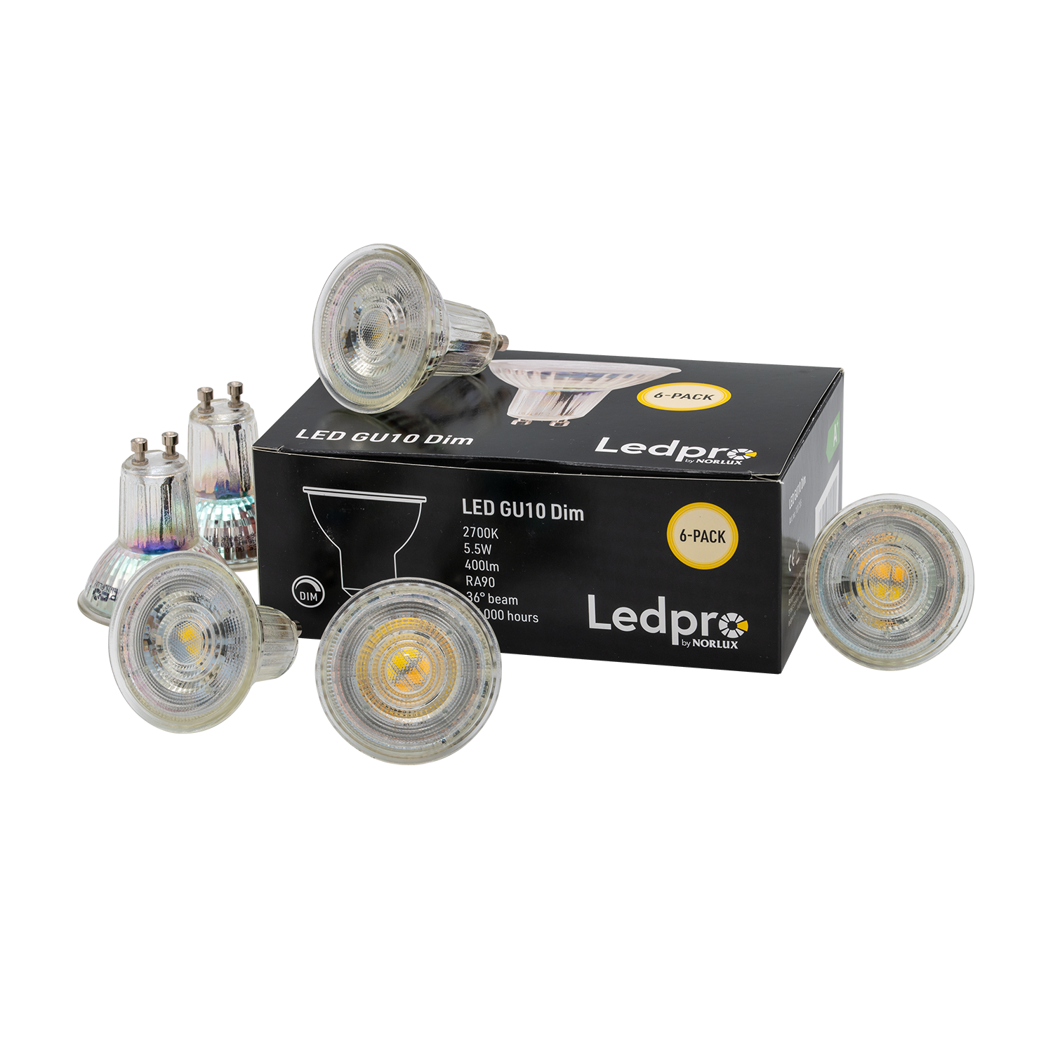 Denne 6-pakningen inneholder vår egen dimbare GU10 LED 5,5W 2700K LED-pære. Denne LED-pæren har en fargetemperatur på 2700K, noe som gir et varmt og lunt lys. Pæren har en lysspredning på 36 grader og en lysstyrke på 400 lumen, noe som gjør at den kan være en god lyskilde for å skape en hyggelig atmosfære i hjemmet eller på uteplassen.