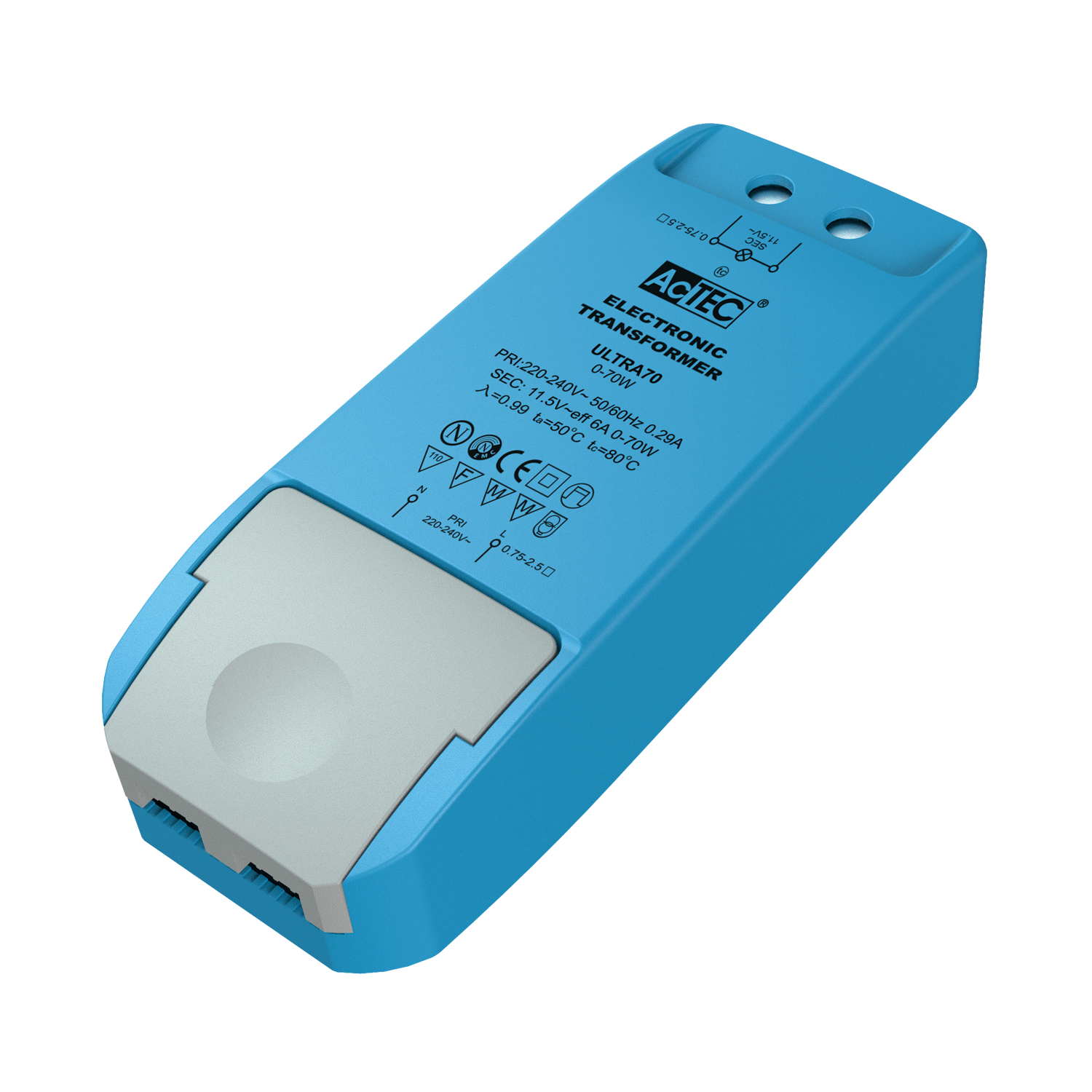 Dimbar elektronisk transformator med 12Vac utgang (11,5V) for halogen lyskilder (0-70W) eller LED lyskilder (0-50W). Maks 6 stk LED tilkoblet. OBS! 12V ac, Ikke dc.